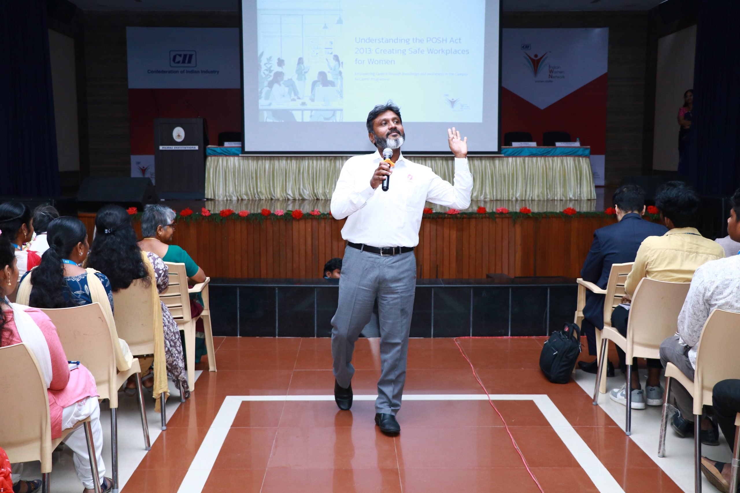 The first technical session, led by Mr. Vijay Sheshadri, focused on Personality Traits and Attitude Skills, where students actively participated in exercises aimed at self-awareness, building emotional intelligence, and cultivating a growth mind-set, all essential for long-term career success. This was followed by a critical session on POSH (Prevention of Sexual Harassment), delivered by Mr. Harishankar Ethiraj of Lexposh, who educated participants on the legal framework, workplace rights, and the importance of fostering a culture of safety and mutual respect in professional settings. The interactive nature of this session helped students gain clarity on how organizations implement POSH policies and the role individuals play in upholding workplace ethics.
