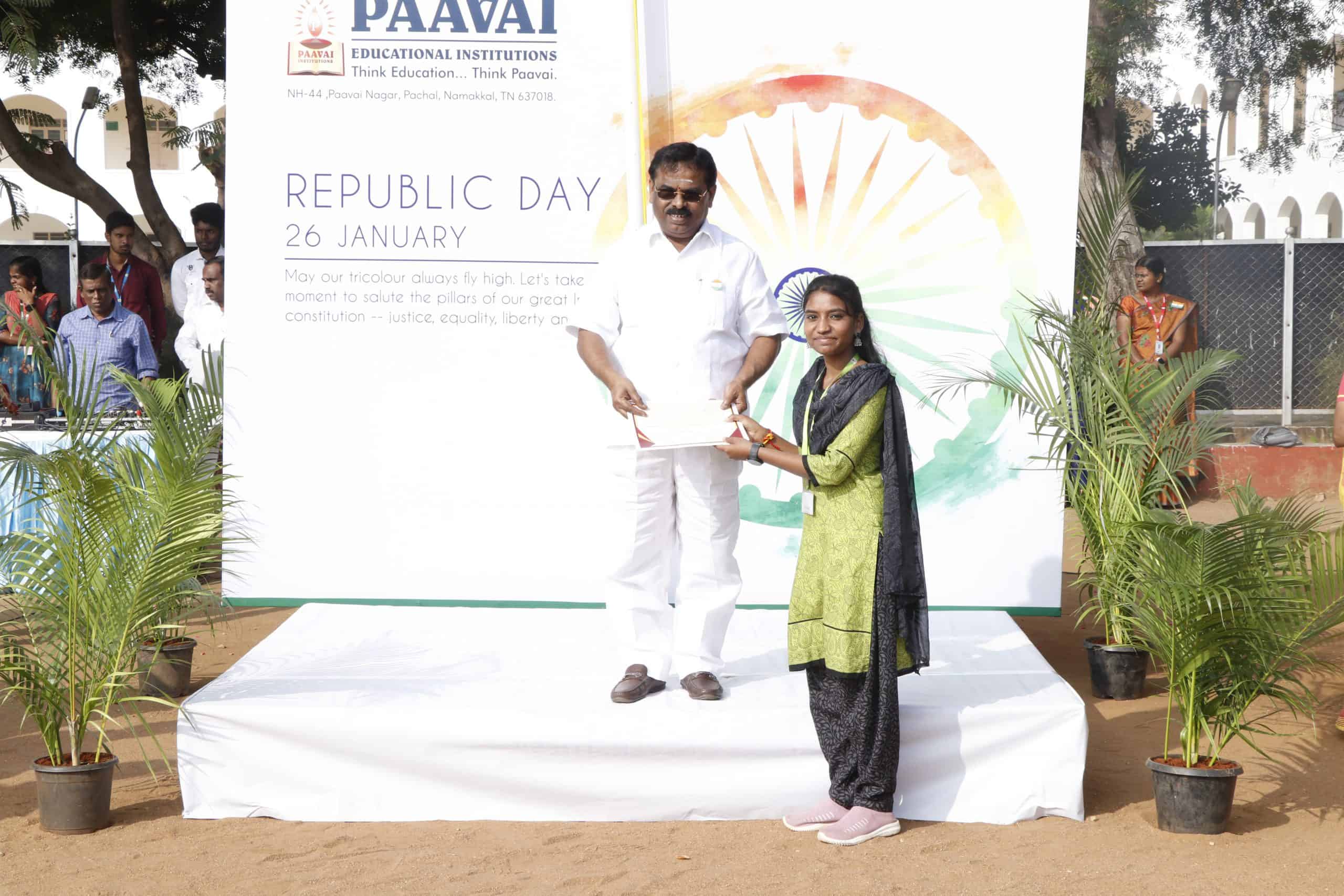 The 73rd Republic Day celebrations were celebrated at the Kalpana Chawla Open Theater on January 26, 2023. Mr. Shri.CA.N.V.Natarajan, Chairman of Paavai Institutions presided over the event. He received a general salute from the students in the parade and raised the national flag.
